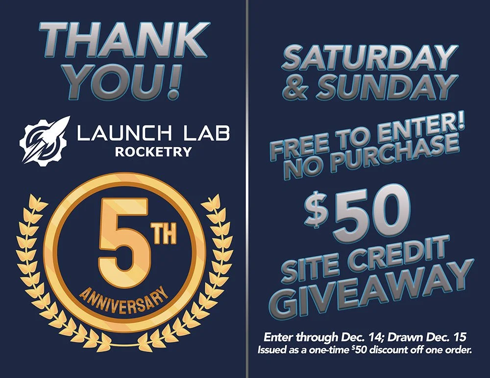 Launch Lab Rocketry is giving away a $50 Shopping Spree on launchlabrocketry.com! Participants can earn one entry into this promotion by signing up on launchlabrocketry.com/5th-giveaway. 1 entrant will win the grand prize of a $50 Shopping Spree, as defined below.