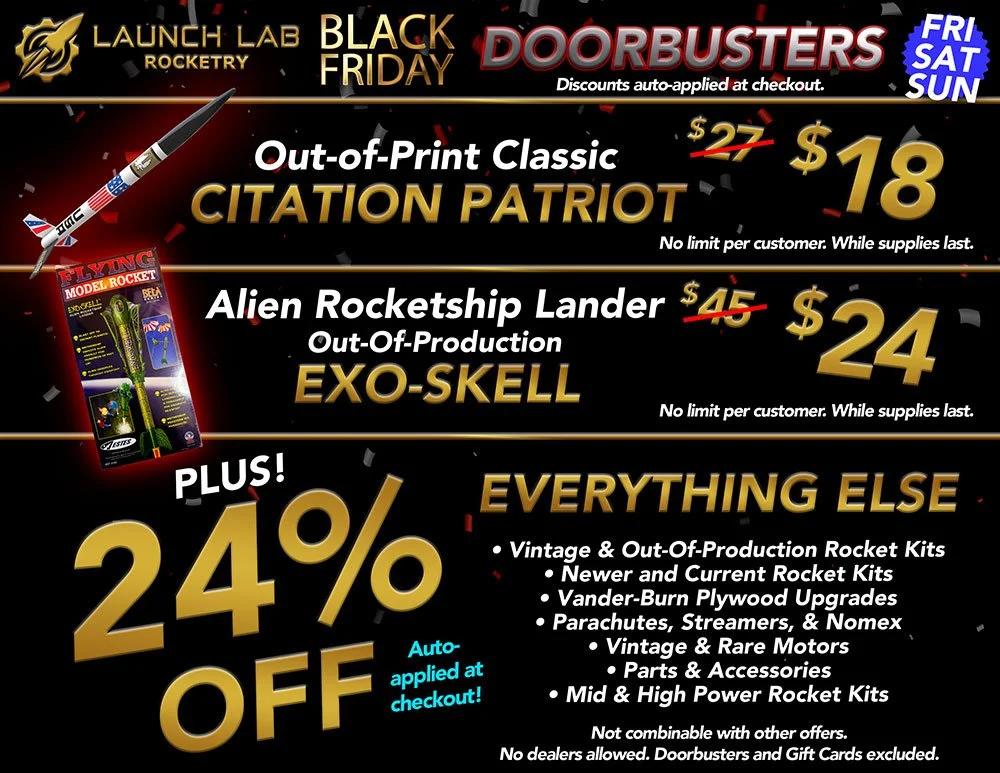 PLEASE NOTE: EACH DISCOUNT WILL ONLY BE LIVE FROM MIDNIGHT ET 11/29 TO 3AM ET 12/2 and will be automatically applied at checkout. Shop all weekend and we’ll hold your purchases until the event is over, combine shipping charges and ship everything together. And as always, if you’ve paid significantly more in shipping costs than it costs us to ship, we’ll refund the difference! Also, if your order subtotals add up to $150 (after discounts), we’ll refund all shipping charges and ship “standard shipping” in the USA for free! Please be patient with order processing times after this sale - it’s our busiest time of the year.