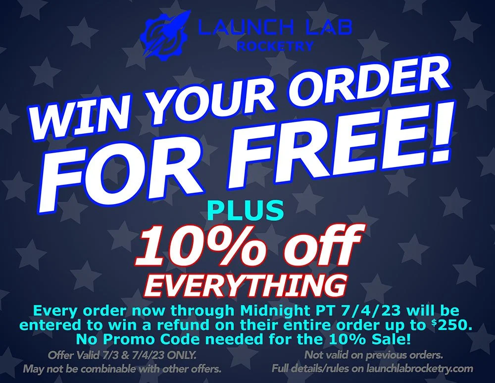 Launch Lab Rocketry is giving away an order refund up to $250! Participants can earn one entry for every order they place on launchlabrocketry.com on 7/3/23 and through midnight PT 7/4/23. 1 entrant will win the grand prize of a complete refund on their order, as defined below.